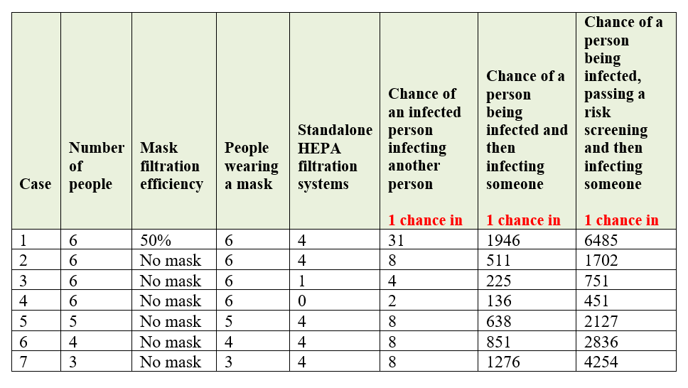 With respect to the above case, if we assume one person is infected and doesn’t know it, and nobody wear as mask, there is 1 chance in 31 that an additional person will become infected. Likewise, there is 1 chance in 4 that a person will become infected if there is only 1 properly placed HEPA air filtration system and nobody wears a mask in the room. There is 1 chance in 2 (50%) that someone will become infected if there is no air filtration and no one wears a mask.