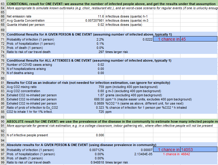 The chances of infection is the relative risk table above are estimates. The model used here is based on a standard model of aerosol disease transmission, the Wells-Riley model. It is calibrated to COVID-19 based on recent literature on quanta emission rate. According the the developers, “…this is NOT an epidemiological model, rather can take input from such models for the average rate of infection for a given location and time period.”