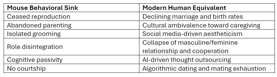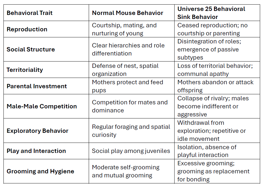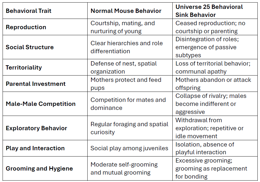This paper presents a sociocultural analysis of contemporary human behavioral decline. drawing on John Calhoun’s Universe 25 mouse experiments. The core argument is that modern societies, particularly in technologically advanced, urbanized contexts, are experiencing a form of “behavioral sink”: a collapse of social, reproductive, and relational vitality despite or because of material abundance in the United States.